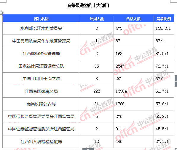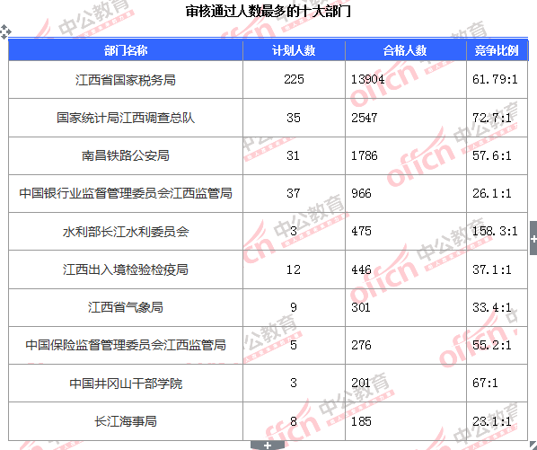 截止到8日17:30時,通過審核人數(shù)前三位的部門依次是:江西省國家稅務(wù)局、國家統(tǒng)計局江西調(diào)查總隊、南昌鐵路公安局,三部門通過審核總?cè)藬?shù)達18237人,占通過審核總?cè)藬?shù)的85.3%。
