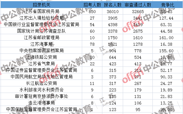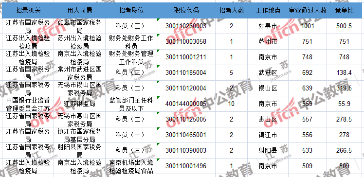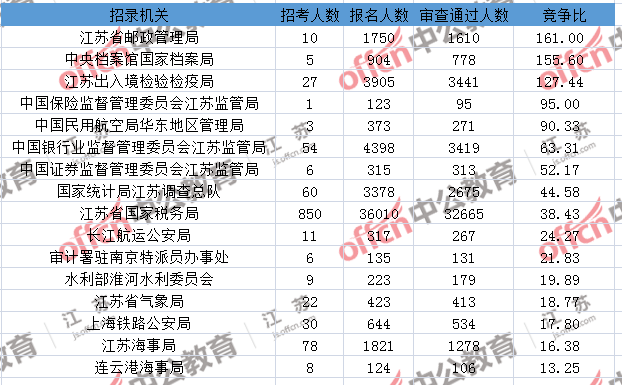 報名通過審核人數(shù)前十的職位主要集中在江蘇出入境檢驗檢疫局、江蘇省郵政管理局、江蘇省國家稅務(wù)局等部門,具體信息如下:
