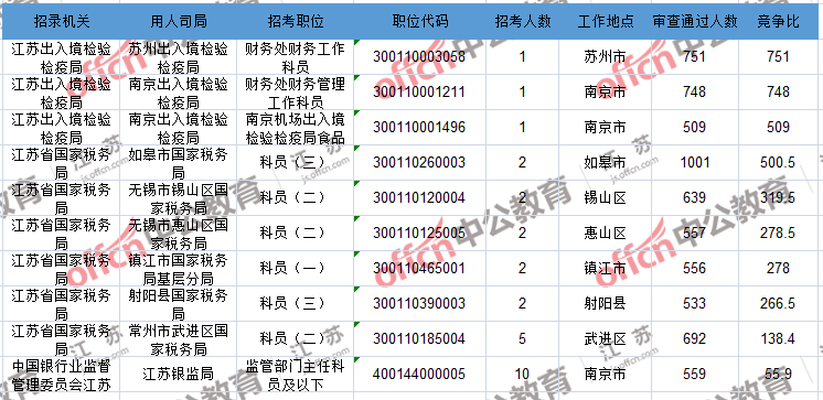 截止到8日17:30時,競爭比例的職位為江蘇出入境檢驗檢疫局蘇州出入境檢驗檢疫局財務(wù)處財務(wù)工作科員一職,招錄1人,截止到6日16時通過人數(shù)為751人。