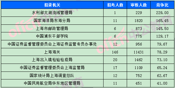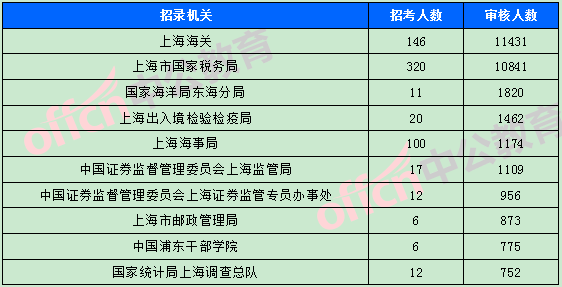 為幫助廣大考生更清晰的了解今日?qǐng)?bào)名情況,上海中公網(wǎng)校整理了審核通過人數(shù)前十位的部門以及競爭比例最激烈的十大部門,供廣大考生參考:
