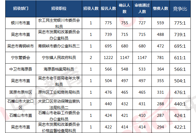 截止到3月31日10:00,報名競爭最激烈前三位職位依次是:農(nóng)工民主黨銀川市委員會科員、吳忠市發(fā)展和改革委員會辦公室科員、青銅峽市委辦公室科員二。三職位報名人數(shù)達2173人,占報名總人數(shù)的4%。為幫助廣大考生更清晰的了解今日報名情況,中公網(wǎng)校整理了競爭最激烈的十大職位,供廣大考生參考,競爭比為775:1。
