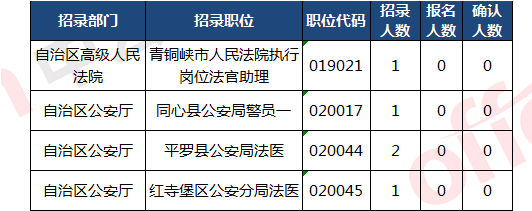 截止到31日10:00,無人報考職位:共有4個是:青銅峽市人民法院執(zhí)行崗位法官助理、同心縣公安局警員一、平羅縣公安局法醫(yī)、紅寺堡區(qū)公安分局法醫(yī)、。下面是無人報考職位一覽表,中公網(wǎng)校專家建議廣大考生多關注一些較冷職位,避免激烈競爭,結合自身條件,找到屬于自己的職位。