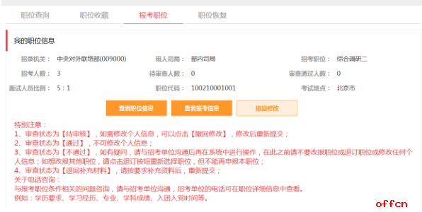 在選完職位要時刻注意自己的審查結(jié)果,注意查看自己時候通過審核。報考人員請于2018年10月22日至11月2日期間登錄考錄專題網(wǎng)站查詢是否通過資格審查。通過資格審查的,不能再報考其他職位。2018年10月22日8:00至10月31日18:00期間,報考申請尚未審查或未通過資格審查的,可以改報其他職位。2018年10月31日18:00至11月2日18:00期間,報考申請未審查或未通過資格審查的,不能再改報其他職位。