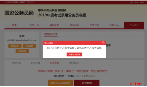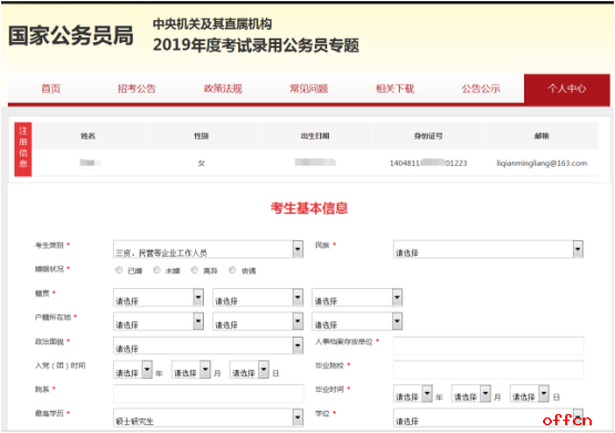 中公教育專家提醒考生,點擊“完善個人信息”之后就要進入全面填寫信息頁面,考生們此時可將相關(guān)的證件準備出來,以便填寫時準確輸入,頁面詳情如下: