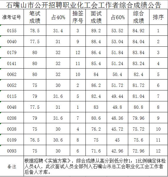 2015寧夏石嘴山市職業(yè)化工會工作者招聘綜合成績公告