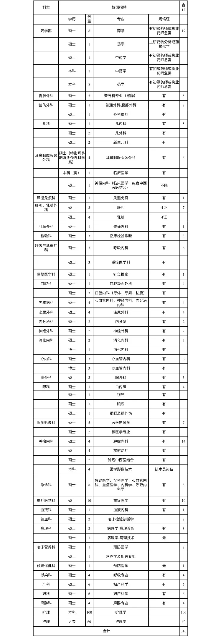 三、應屆(2019、2020年)畢業(yè)生。醫(yī)療、醫(yī)技專業(yè)需取得碩士及以上學歷,取得執(zhí)業(yè)證書、規(guī)培證書;藥學、檢驗、技師專業(yè)需取得碩士及以上學歷,取得執(zhí)業(yè)證書;護理學專業(yè)需取得統(tǒng)招全日制??萍耙陨蠈W歷(不含3+2???,要求高中起點(不含職業(yè)高中),取得護士執(zhí)業(yè)證書;