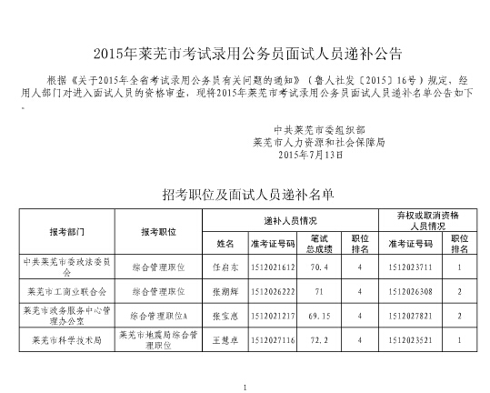 2015山東萊蕪市公務(wù)員面試遞補(bǔ)公告