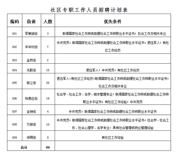 面向社會招聘社區(qū)專職工作人員89人,具體招聘計(jì)劃見下表: