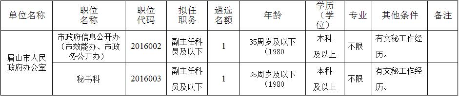 7.其他條件見(jiàn)《眉山市市級(jí)機(jī)關(guān)面向基層公開(kāi)遴選公務(wù)員職位表》(附件1)。