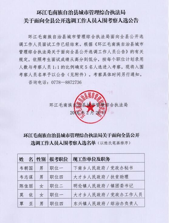2016廣西環(huán)江縣選調(diào)考察人選公告