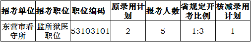 東營(yíng)市2016年公務(wù)員招錄報(bào)名工作已結(jié)束,根據(jù)省委組織部、省人力資源社會(huì)廳、省公務(wù)員局《關(guān)于印發(fā)2016年度全省考試錄用公務(wù)員工作實(shí)施方案的通知》(魯人社發(fā)〔2016〕11 號(hào))和《東營(yíng)市各級(jí)機(jī)關(guān)及直屬單位考試錄用公務(wù)員公告》的有關(guān)規(guī)定,東營(yíng)市看守所監(jiān)所獄醫(yī)職位因未達(dá)到規(guī)定開(kāi)考比例應(yīng)核減錄用計(jì)劃1人?,F(xiàn)將核減錄用計(jì)劃的職位公告如下: