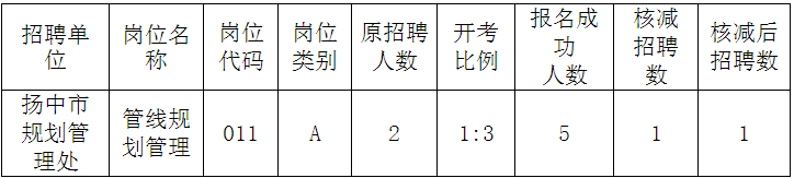 根據(jù)《揚(yáng)中市事業(yè)單位2016年公開招聘工作人員公告》(鎮(zhèn)揚(yáng)人社事招公告〔2016〕1號(hào)),揚(yáng)中市規(guī)劃管理處的管線規(guī)劃管理崗位因報(bào)名人數(shù)不足,予以核減,具體如下表: