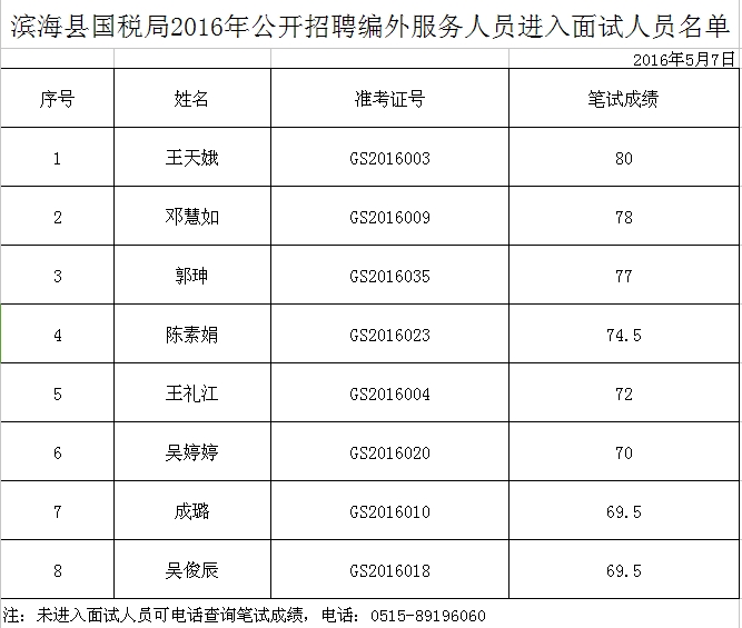 根據(jù)《濱海縣國(guó)稅局2016年公開招聘編外服務(wù)人員公告》,經(jīng)過筆試,現(xiàn)將進(jìn)入面試人員名單予以公示(見附表)。面試時(shí)間為2016年5月8日(星期日)下午,地點(diǎn)為濱??h人才服務(wù)中心(縣城人民中路170號(hào))。請(qǐng)參加面試人員攜帶身份證、筆試準(zhǔn)考證于5月8日下午2:00前到達(dá)指定地點(diǎn)集中,遲到15分鐘者視為自動(dòng)放棄面試資格。