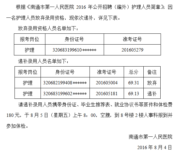 原標(biāo)題:南通市一院2016年公開招聘(編外)護理人員遞補錄用人員公告
