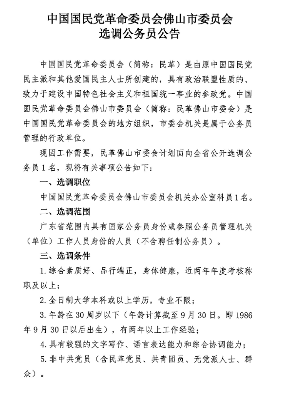 2016廣東中國(guó)國(guó)民黨革命委員會(huì)佛山市委員會(huì)選調(diào)公務(wù)員公告【招1人】