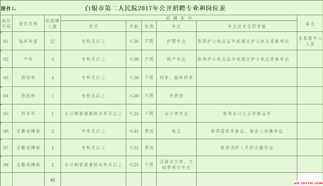 本次招聘工作人員共40名,其中:護(hù)理人員30名、藥劑人員5名、財(cái)務(wù)人員1名、電工2名、消防人員1名,文秘人員1名。