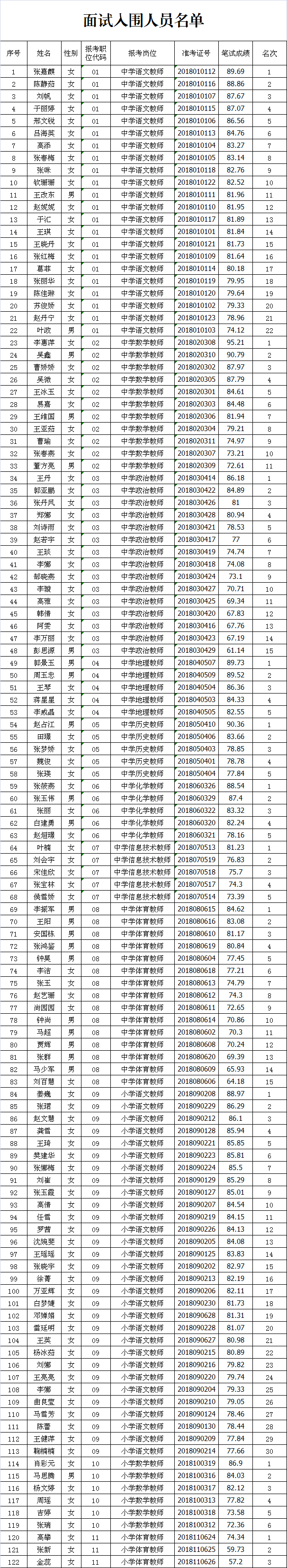 嘉峪關(guān)市2018年教育系統(tǒng)公開招聘教師筆試工作已經(jīng)結(jié)束,根據(jù)《嘉峪關(guān)市2018年教育系統(tǒng)公開招聘教師公告》規(guī)定,按照筆試成績從高到低排序,最終確定進(jìn)入面試人員122人?,F(xiàn)將面試有關(guān)事項(xiàng)和入圍人員名單公布如下: