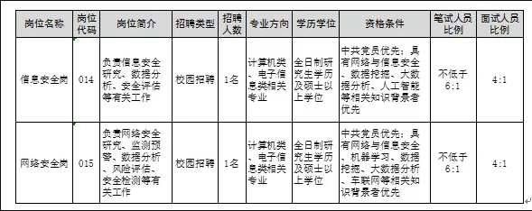 校園招聘2名,其中信息安全崗人員1名,網(wǎng)絡安全崗人員1名。