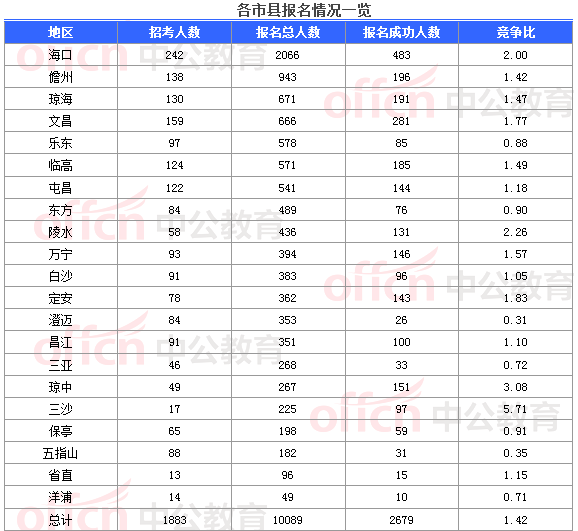 2018海南公務(wù)員考試報名數(shù)據(jù)查看功能于3月27日16時關(guān)閉,截至3月26日15時。據(jù)海南中公教育統(tǒng)計,報名人數(shù)達(dá)2679人,報名總?cè)藬?shù)為10089人,競爭比例達(dá)35:1。仍有165個職位無人報名,平均競爭比例為1.42:1??忌枳⒁膺@并不是最終的報名人數(shù),報名截止是2018年3月29日16:00,確認(rèn)時間是截至2018年3月29日。